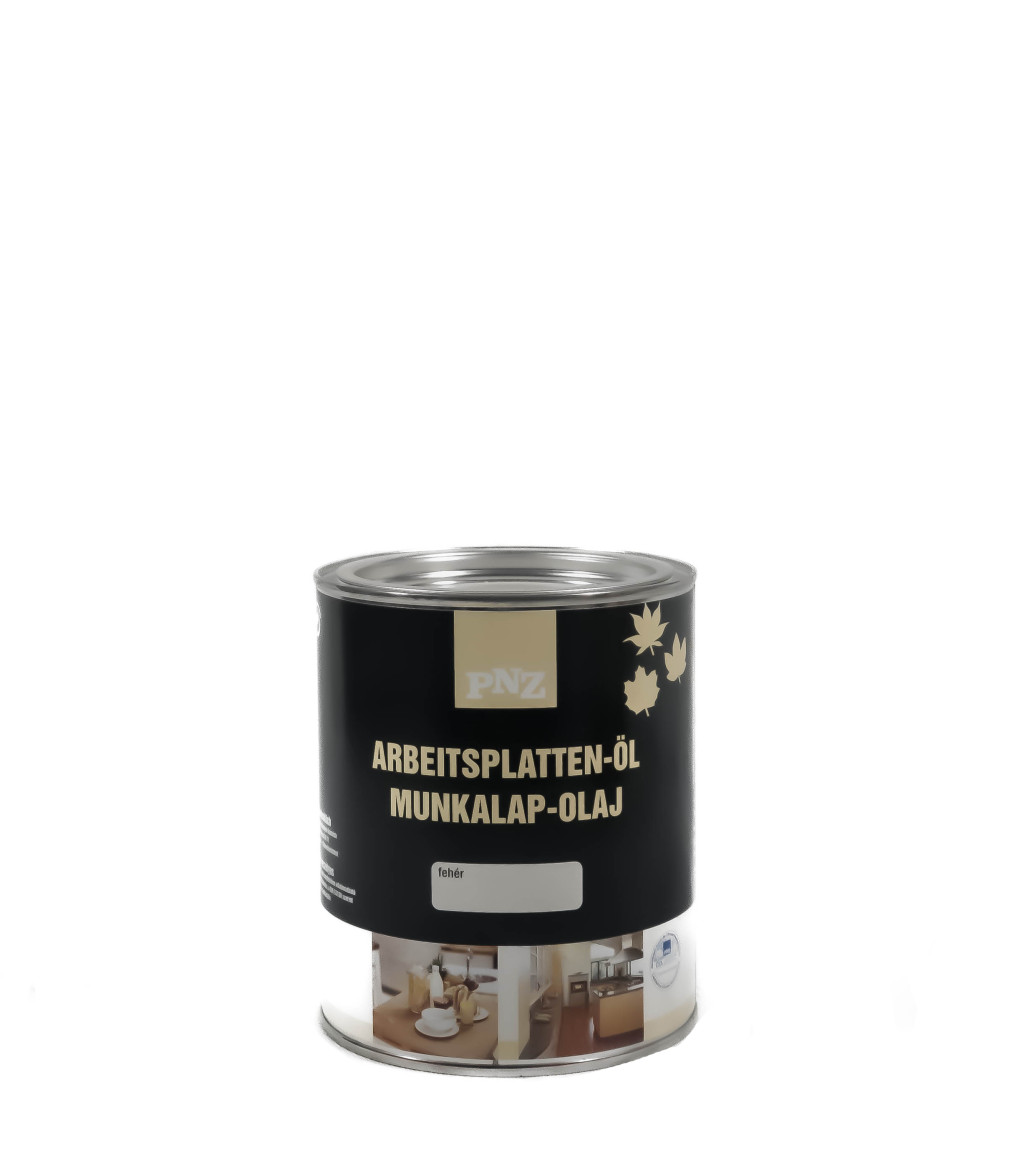Műszaki adatok és felhasználásPNZ ARBEITSPLATTEN- UND MÖBELÖL – Munkalap- és bútorolajTulajdonságokSzíntelen vagy fehér, nyitott pórusú, nedvességszabályozó, magas töltő- és jó behatoló képességű faolaj, amely kiváló felületvédelmet nyújt a fának. Víz- és szennyeződés-taszító, környezetkímélő bevonat konyhai munkalapokra, asztallapokra és bútorokra. Az EN 71 szabványnak megfelel, ezért gyermekjátékokra is alkalmazható.Felhasználási területBármely beltéri, nyers és lúgozott fafelületre alkalmas.AlapfeltételekA kezeletlen fa legyen tiszta, gyantamentes és finoman csiszolt. A fa nedvességtartalma ne haladja meg a 14%-ot. Az olaj és a helyiség hőmérséklete legyen legalább 18 °C, a levegő páratartalma pedig 60% körüli.FigyelemTömör, enyvezett és furnérozott fák eltérően veszik fel az olajat, ezért színeltérések fordulhatnak elő. Emiatt feltétlenül végezzünk próbaolajozást egy mintadarabon vagy félreeső felületen.AlkalmazásA terméket olajozó hengerrel vagy ecsettel, nedves a nedvesre eljárással hordjuk fel a felületre, és oszlassuk el addig, amíg egyenletesen nedvesen fénylő felületet nem kapunk, és az olaj már nem szívódik be. Ez fafajtától függően kb. 30–60 perc. Ezután a felesleges olajat bézs színű paddel vagy polírozó párnával maradéktalanul dörzsöljük be a felületbe, amíg a felület száraznak nem látszik. A felületen nem maradhatnak fényes vagy olajcseppes részek. Ezután hagyjuk 24 órát száradni, majd fehér paddel vagy polírozó párnával polírozzuk át. Fontos: a fehér változatot használat előtt alaposan fel kell keverni.Tisztítás és utókezelésAz első tisztítás és utánkezelés legkorábban a felhordás után egy héttel történhet. A felület tisztítható, kezelhető és ápolható PNZ Holzbodenseife – Fapadló tisztítóval.Száradási idő2–3 nap. Ez idő alatt a felületet víztől és erős igénybevételtől védeni kell. Az olajozott felület élettartama erősen függ az első napok használati módjától. A száradás ideje alatt gondoskodni kell a megfelelő szellőzésről, például hagyjuk nyitva az ablakokat. Az oxigénellátás végig legyen megfelelő, és ügyeljünk arra, hogy a hőmérséklet ne süllyedjen 18 °C alá.Használat közbenA munkalap használata során ne hagyjuk a vizet a felületre rászáradni, mindig töröljük szárazra.Kiadósság1 liter kb. 15 m² felületre elegendő első kezelésnél, a fa típusától és a felület minőségétől függően.TárolásHűvös, de fagymentes helyen tárolandó. Eredeti, bontatlan csomagolásában 5 évig eltartható. A maradékot töltsük kisebb edénybe, majd légmentesen zárjuk le. Később is felhasználható marad.Eszközök tisztításaKözvetlenül a használat után lakkbenzinnel tisztítandó.ÖsszetevőkTermészetes olajok (bogáncs, mák, dió, szója, napraforgó), izo-alifátok, ólommentes szárítók. A fehér változat adaléka titánfehér és ólommentes szárítók.Biztonsági előírásokErősen oxidáló anyagokkal reakcióba léphet. 67 °C fölé hevítve, szóráskor lobbanékony keveréket alkothat. A kémiai biztonságról szóló 2000. évi XXV. törvény alkalmazása szempontjából nem minősül veszélyes keveréknek, így biztonsági adatlap kiadása nem szükséges.FontosA termékről szóló információkat legjobb tudásunk és tapasztalataink alapján foglaltuk össze. Ennek ellenére minden felhasználás előtt végezzünk próbakezelést egy félreeső felületen, hogy lássuk a várható eredményt. A faanyagok fajtájától és aktuális állapotuktól függően eltérően reagálhatnak, a végső bevonat minősége pedig függ a felhordás módjától és a környezet jellemzőitől is.